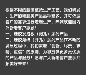 ????我公司生產(chǎn)的硅膠海綿具有耐高溫、耐壓、透氣性能好、抗撕拉、使用壽命長、環(huán)保等特點,主要適用于服裝干洗、水洗熨燙設(shè)備,如壓燙機和燙臺等。另外我們也提供各種燙氈、罩布等整燙專用墊料,客戶可根據(jù)不同熨燙工藝選擇不同的搭配組合,滿足高品質(zhì)的熨燙要求。